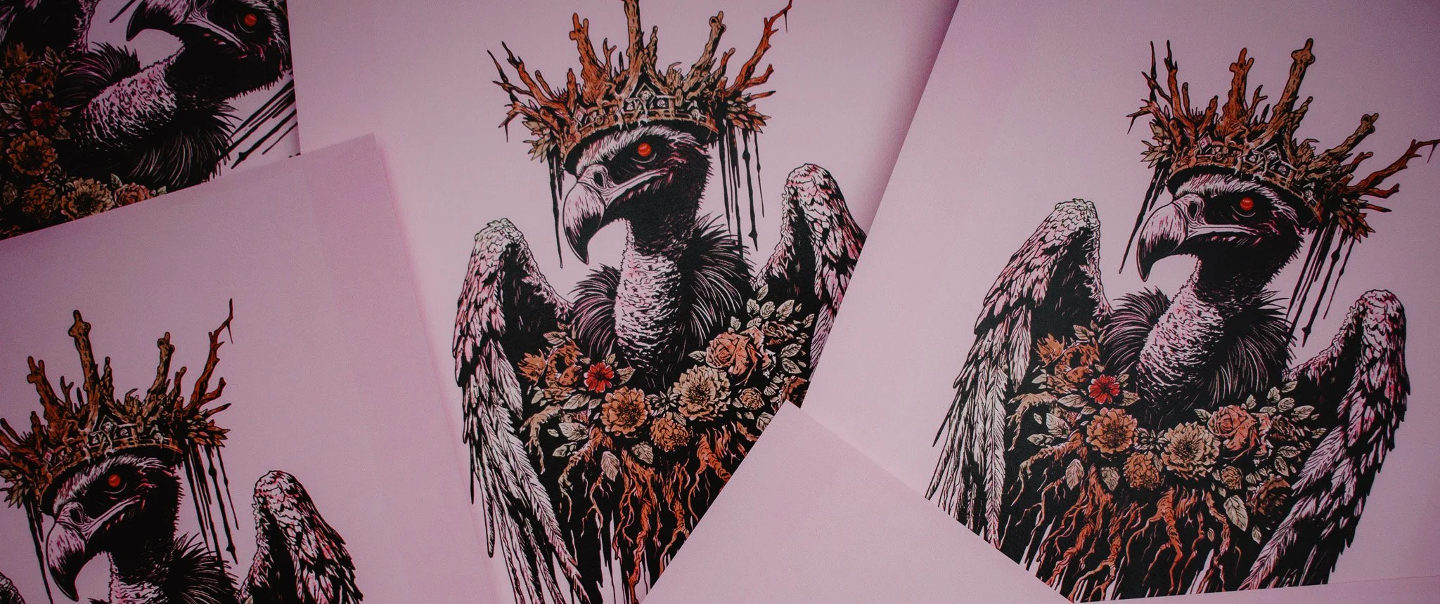 A dark, detailed collection blending tattoo-inspired linework with natural and anatomical themes. The pieces explore the balance between decay and rebirth, pulling inspiration from nature, folklore, and the life cycle. Rich in texture and contrast, the work fuses organic forms with gothic surrealism—showcasing birds, beasts, and figures rendered in striking ink tones and digital color overlays. Each illustration feels alive, raw, and slightly unsettling.